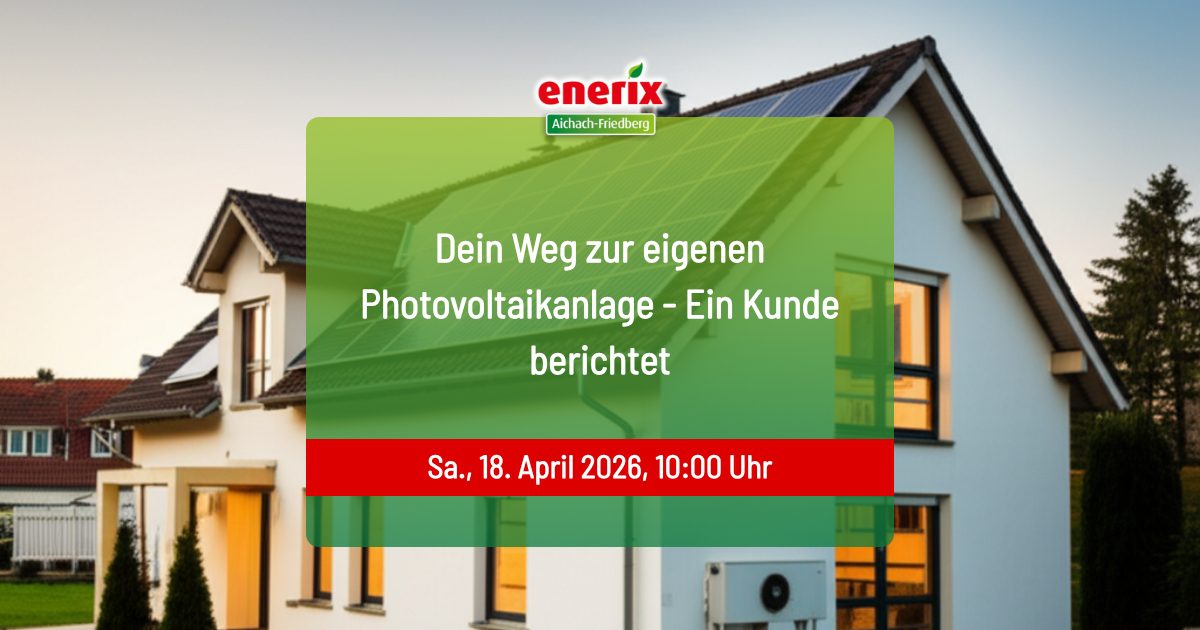 18 Apr. Dein Weg zur eigenen Photovoltaikanlage – Ein Kunde berichtet PV-Anlage? Ein Kunde erzählt live von seinen Erfahrungen! Plus: Weißwurstfrühstück & 500€ Gutschein sichern! Neugierig? 18.04.2026 10:00 Uhr Bauernmarkt Dasing Kostenlos