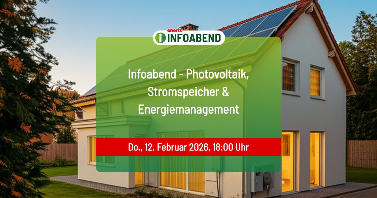 12 Feb. Infoabend – Photovoltaik, Stromspeicher & Energiemanagement PV-Anlage planen? Speicher, E-Auto, Wärmepumpe? Wir zeigen Dir, wie's geht! Melde Dich jetzt für unseren Infoabend an! 12.02.2026 18:00 Uhr enerix Roth-Schwabach Kostenlos