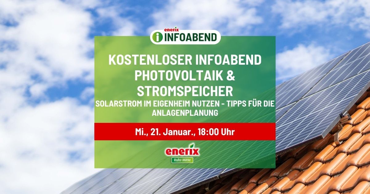 26 Nov. Solarstrom selber herstellen, speichern und Geld sparen Entdecke, wie du mit einer Photovoltaikanlage und einem Stromspeicher deinen eigenen Solarstrom erzeugen und speichern kannst! Reduziere deine Stromkosten um bis zu 80 %. 26.11.2025 18:00 Uhr enerix Kiel Kostenlos