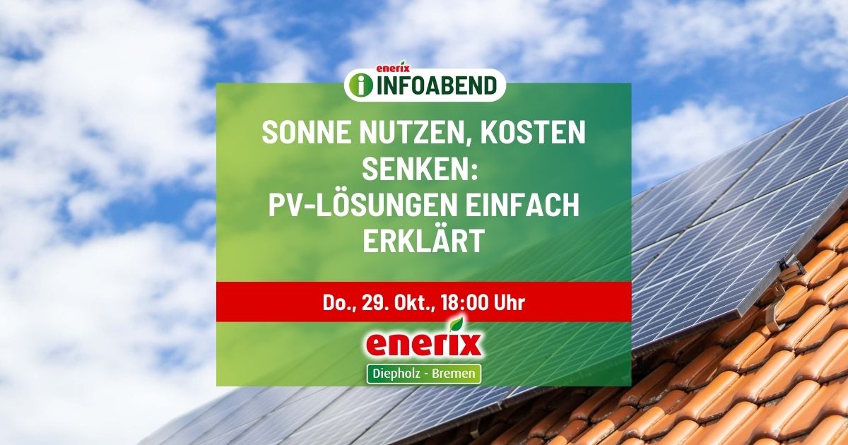 29 Okt. Sonne nutzen, Kosten senken: PV-Lösungen einfach erklärt Erfahre, wie du mit deiner eigenen PV-Anlage Kosten senkst und unabhängiger wirst – verständlich erklärt und mit persönlicher Beratung beim Infoabend von enerix Diepholz. 29.10.2026 18:00 Uhr enerix Diepholz Kostenlos