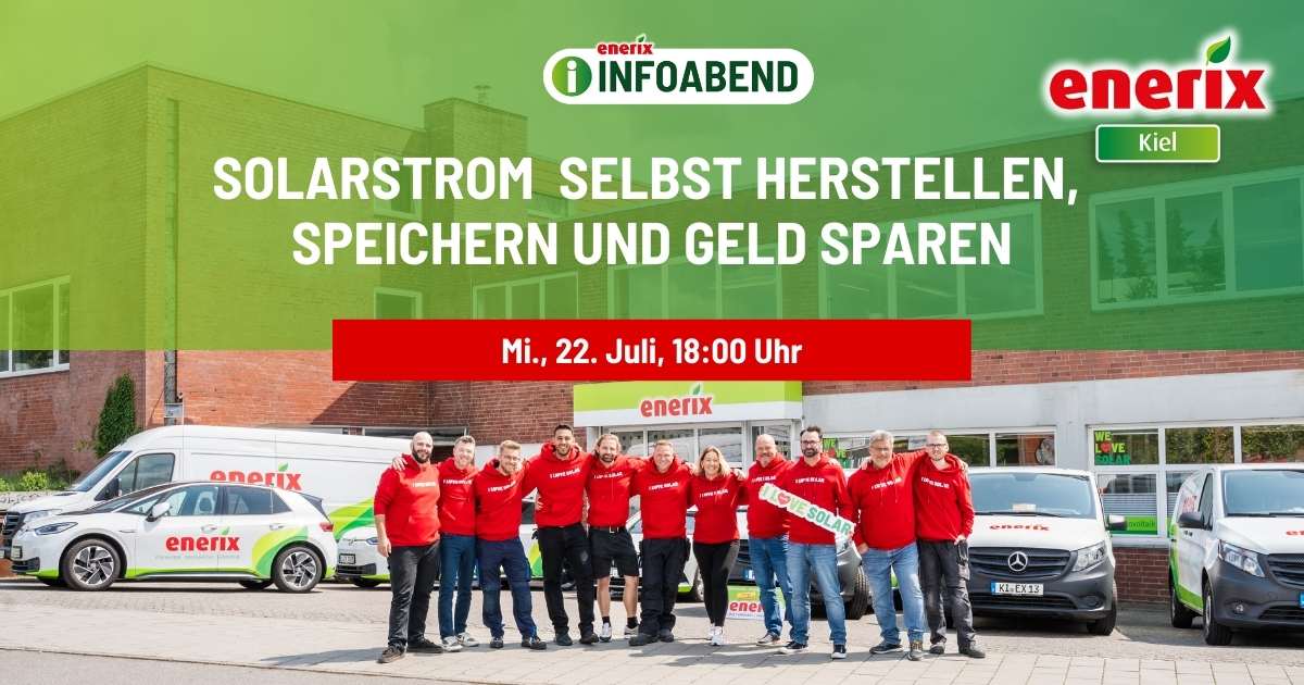 22 Juli Photovoltaik Infoabend Kostenloser PV-Infoabend in Kiel: Erfahre alles zu Photovoltaik, Speicher, Kosten & Förderung. In entspannter Atmosphäre mit Häppchen & Getränken. 22.07.2026 18:00 Uhr enerix Kiel Kostenlos